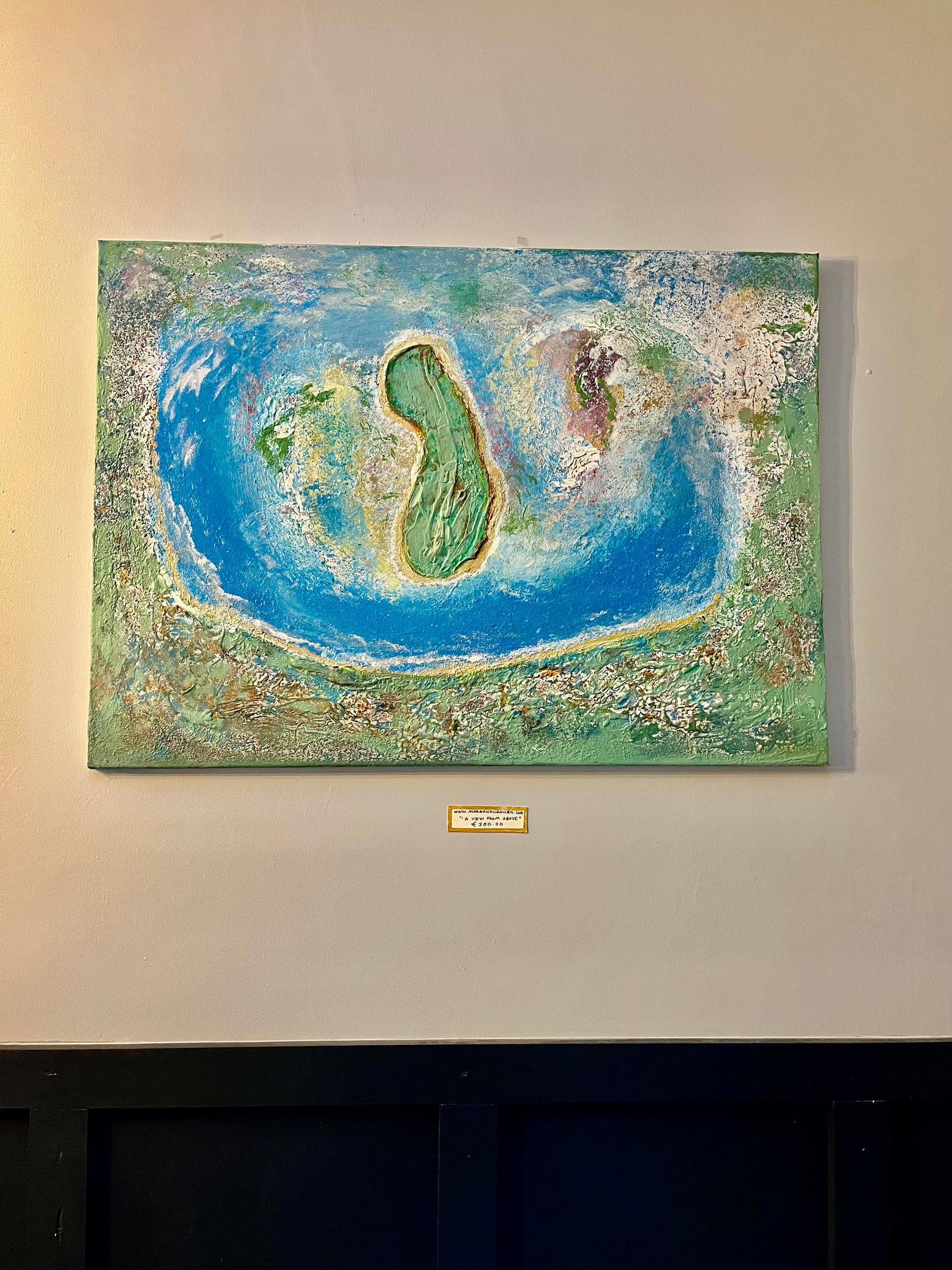 A seascape picture viewed from above ,abstract painting of the sea and and an island looking down from above ,created solely from imagination and not representing any particular part of the world .
