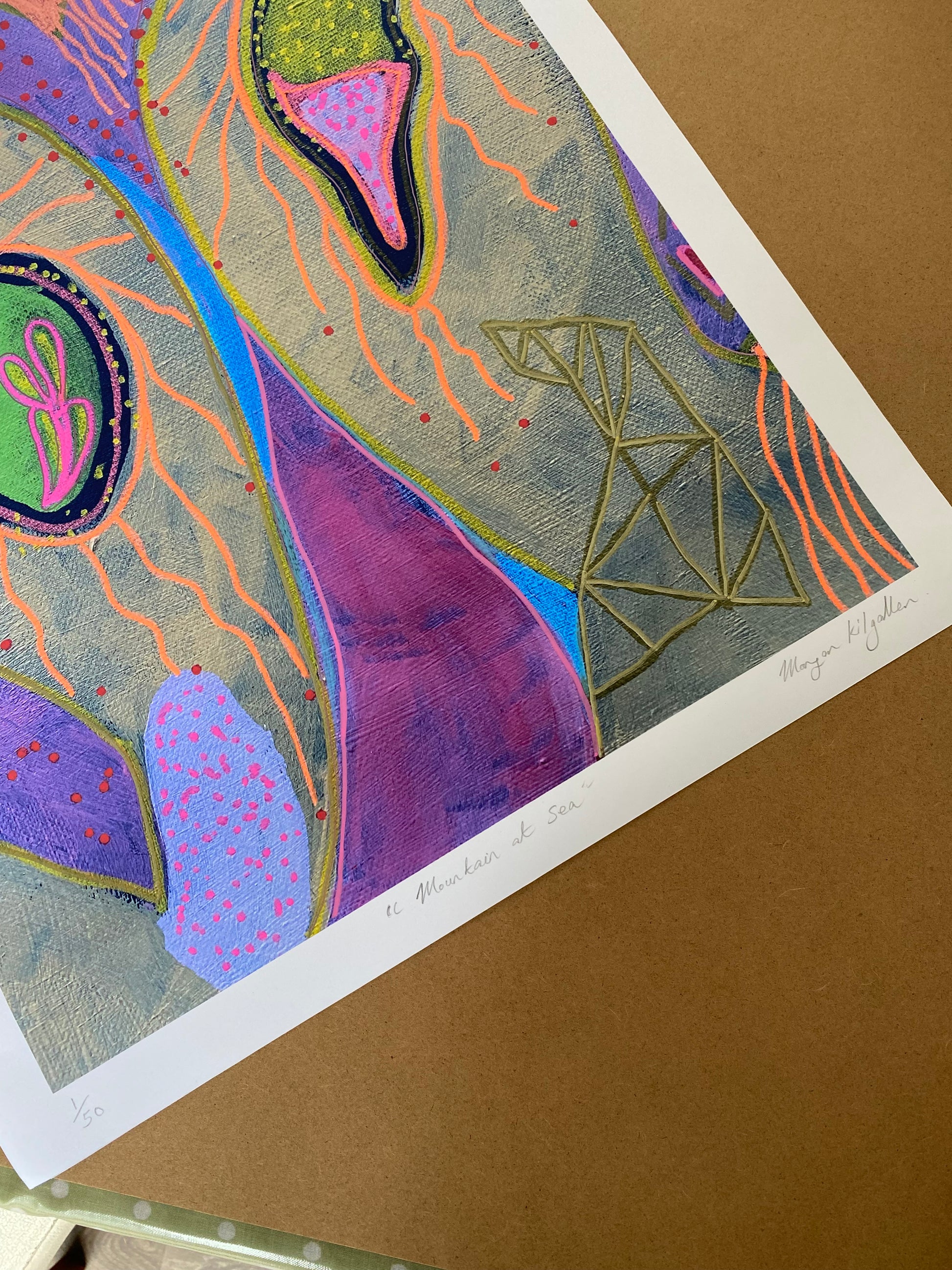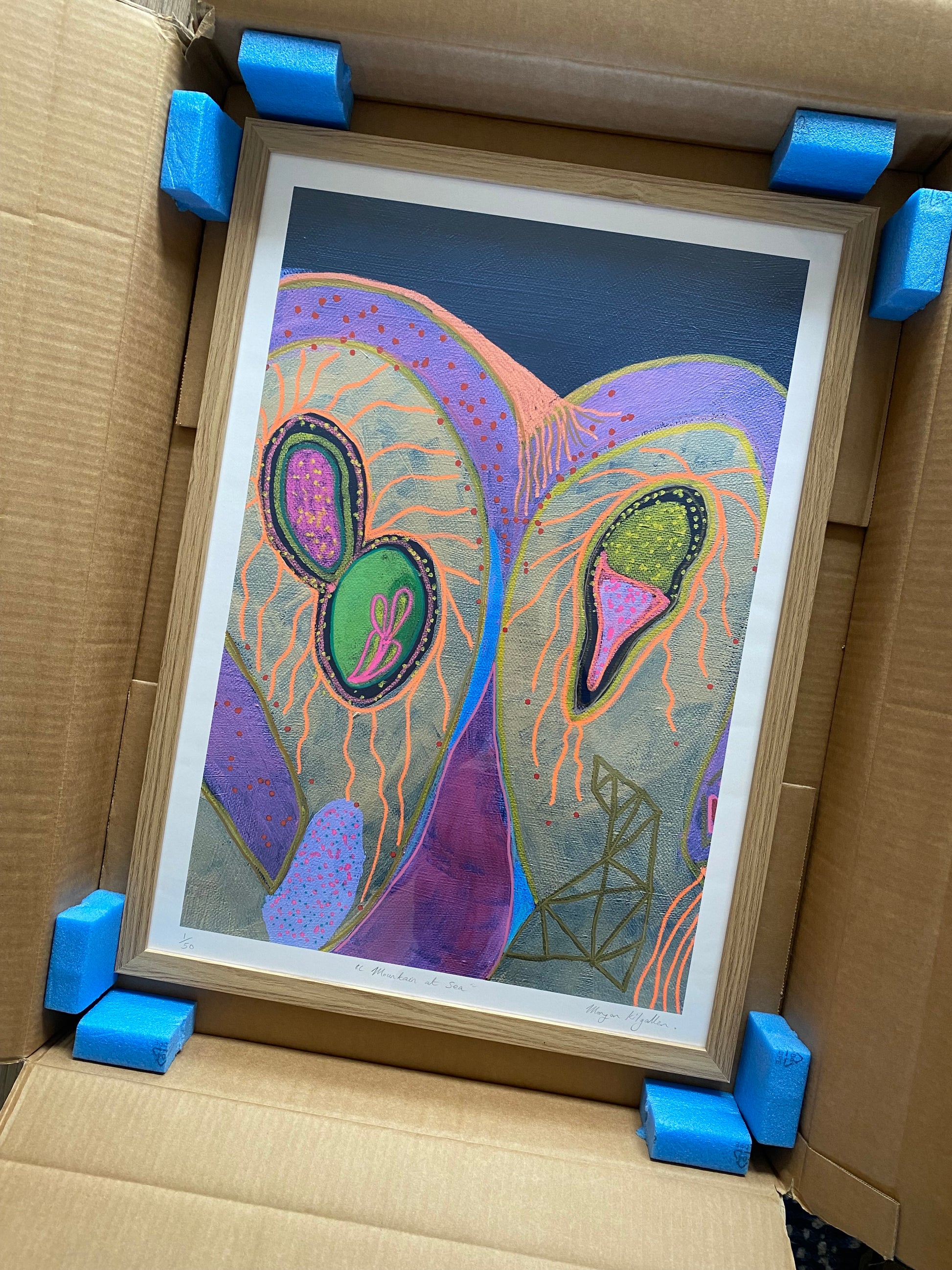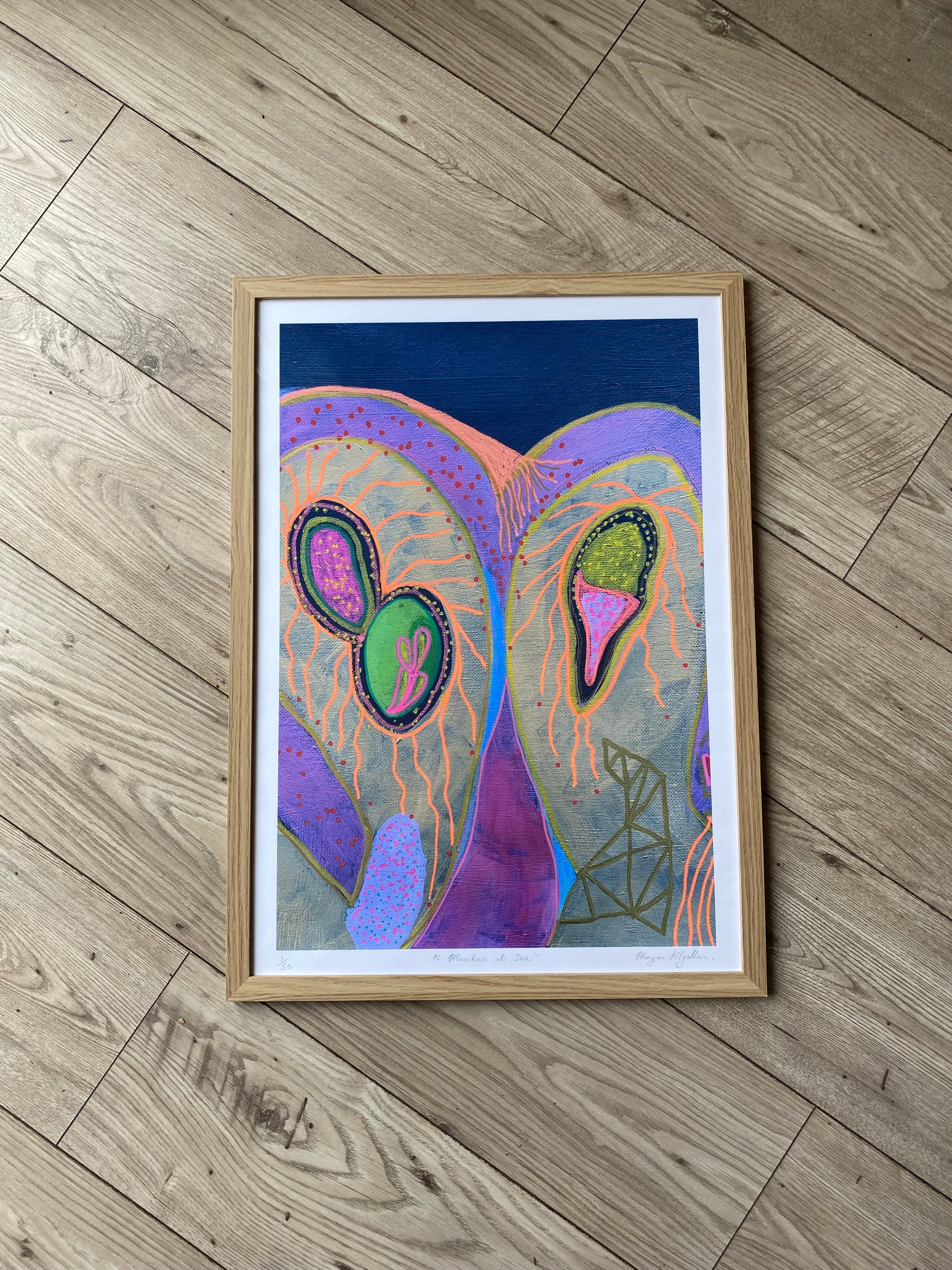 A beautiful contemporary pastel abstract landscape scene on paper ,A2 size with white border framed in solid Oak