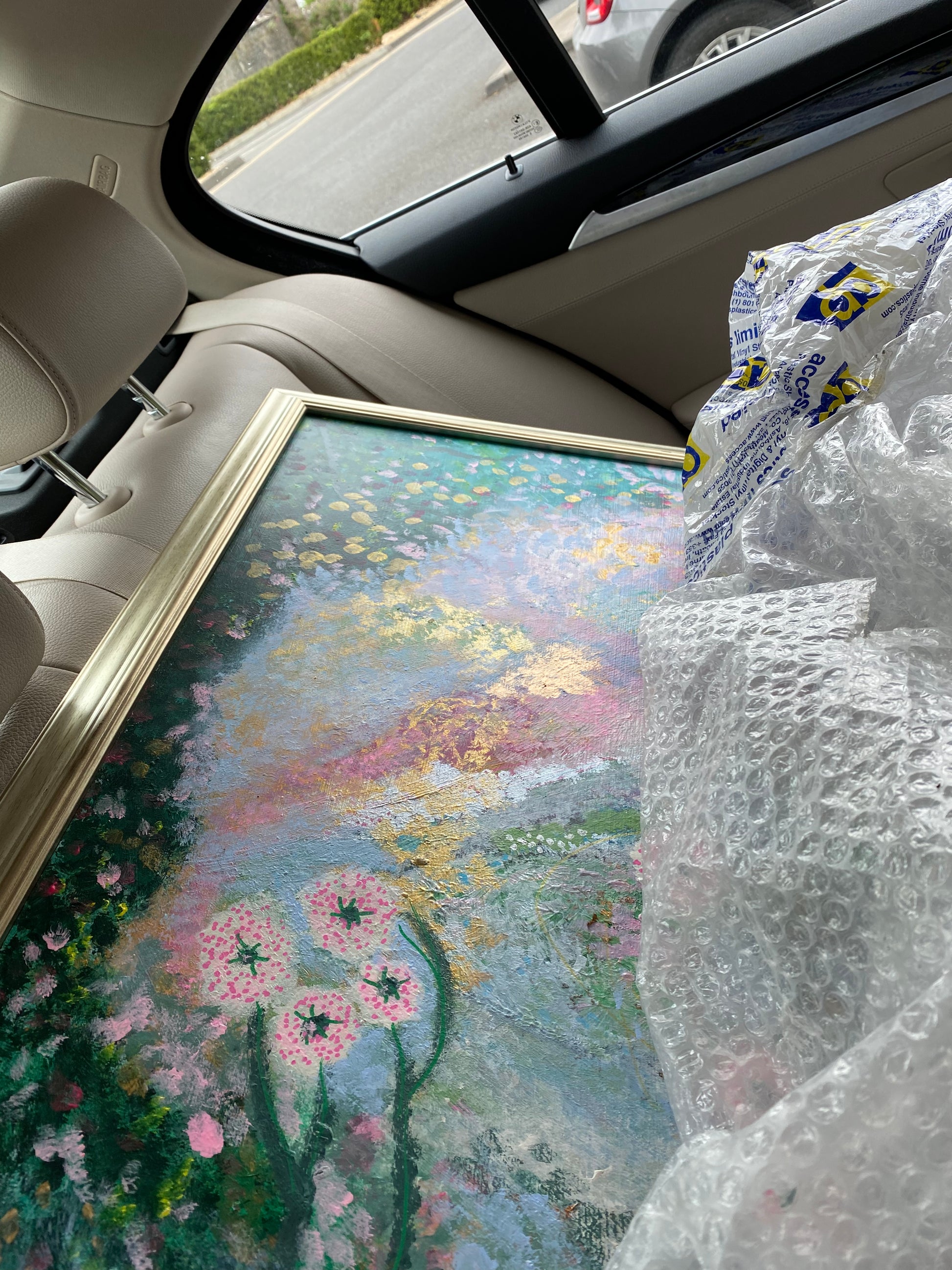 40 inches x 40 inches Oil Painting ,acrylics ,gold leaf on 3 mm Perspex ,framed in double fluted Onyx frame .
