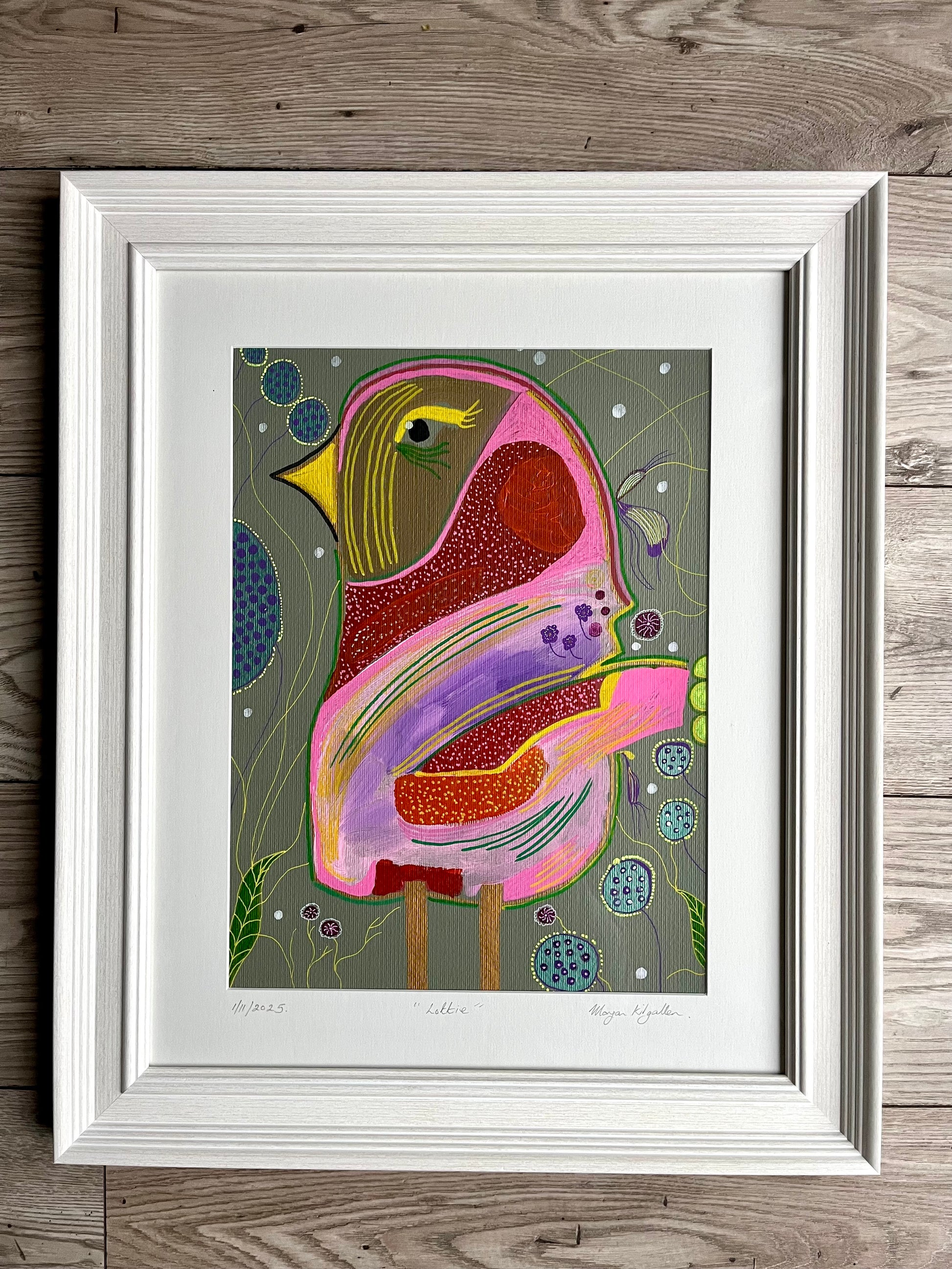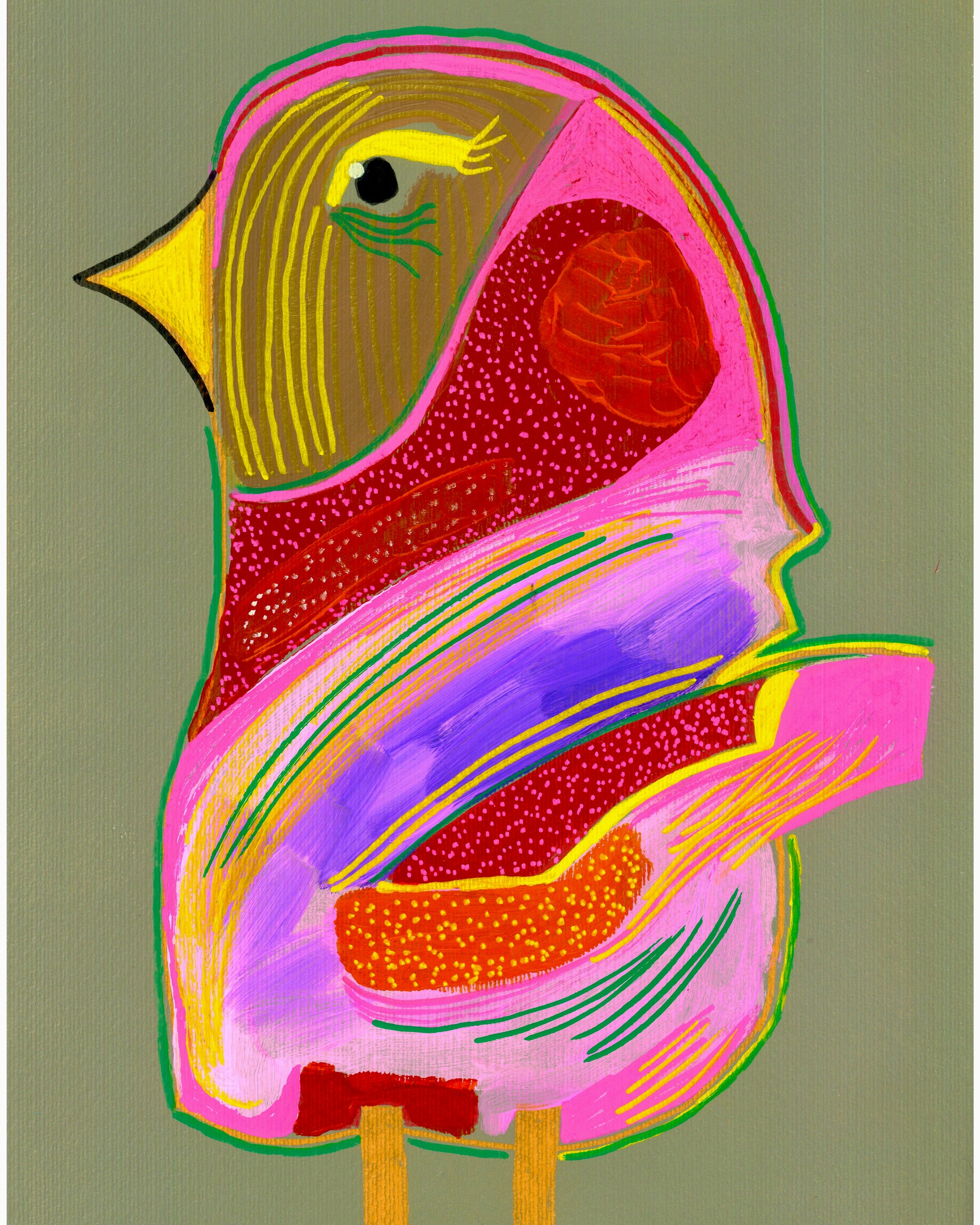 Acrylic Paint on 350 GSM art paper ,pretty bird painting on gold background, colourful bird on A3 art paper ,pink ,purple ,abstract bird on paper available as a limited