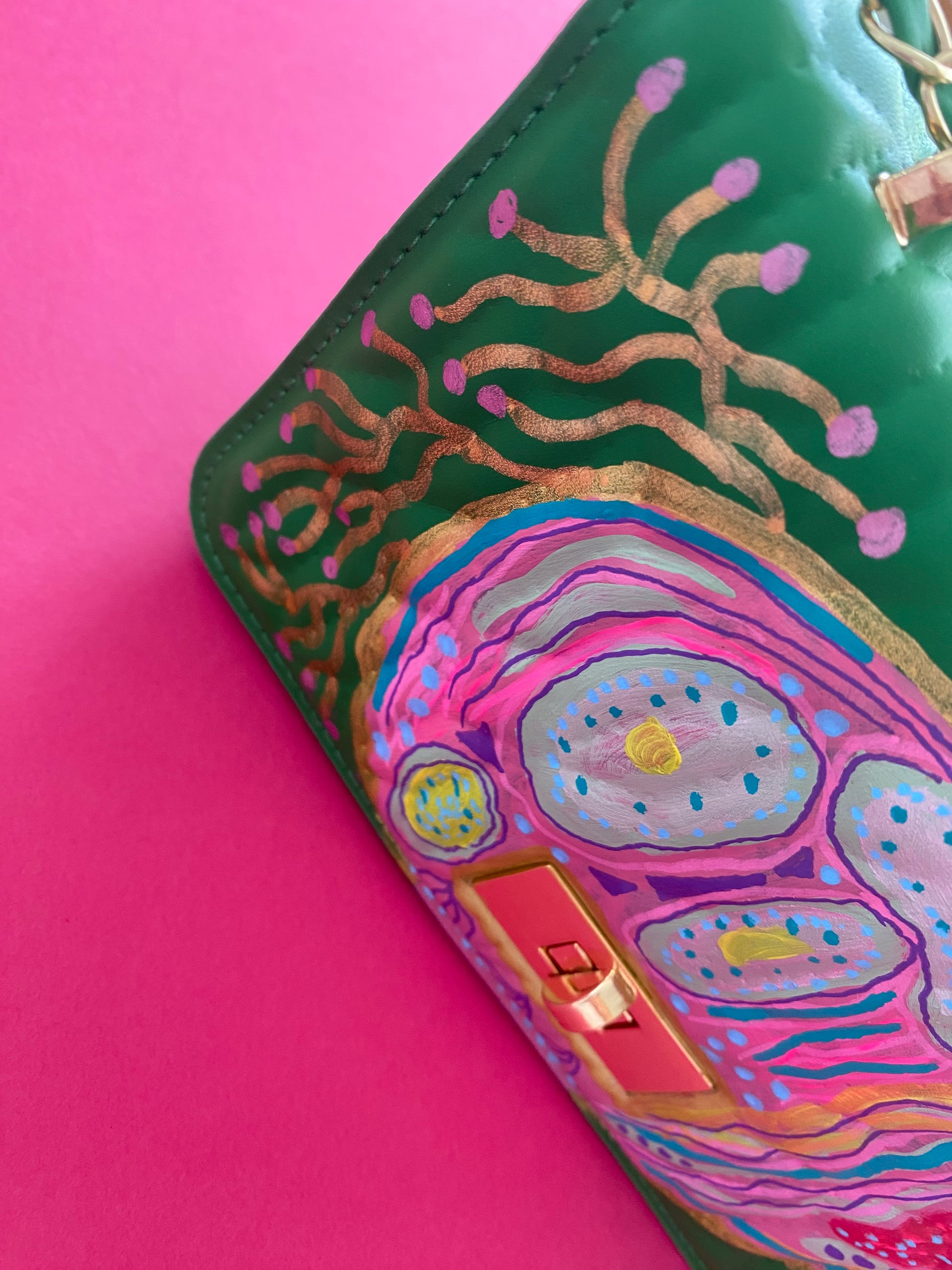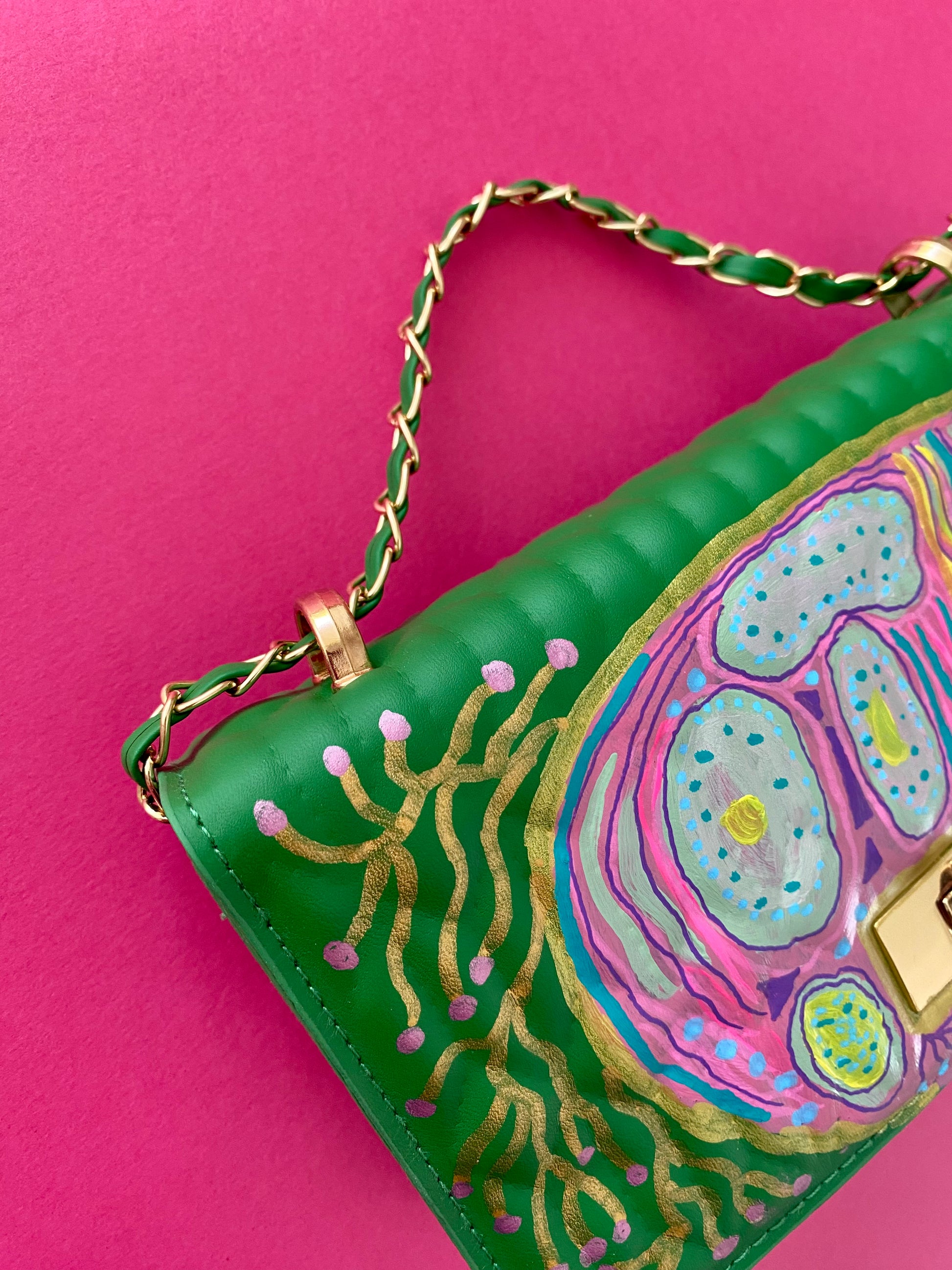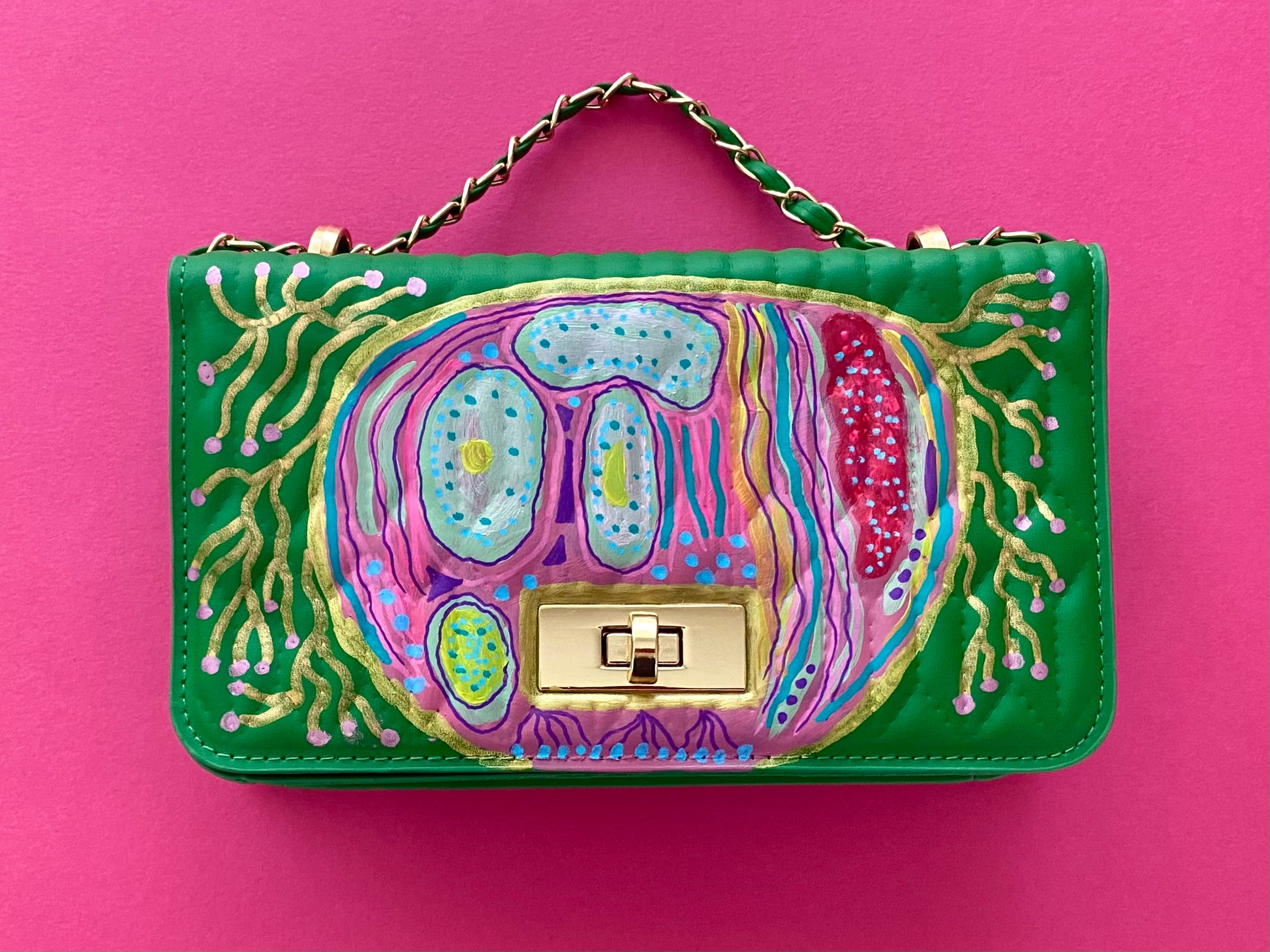 A one of original hand painted hand bag ,painted in acrylic by Artist Morgan Kilgallen .
