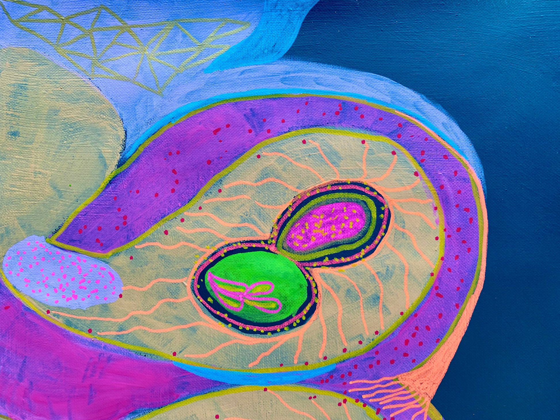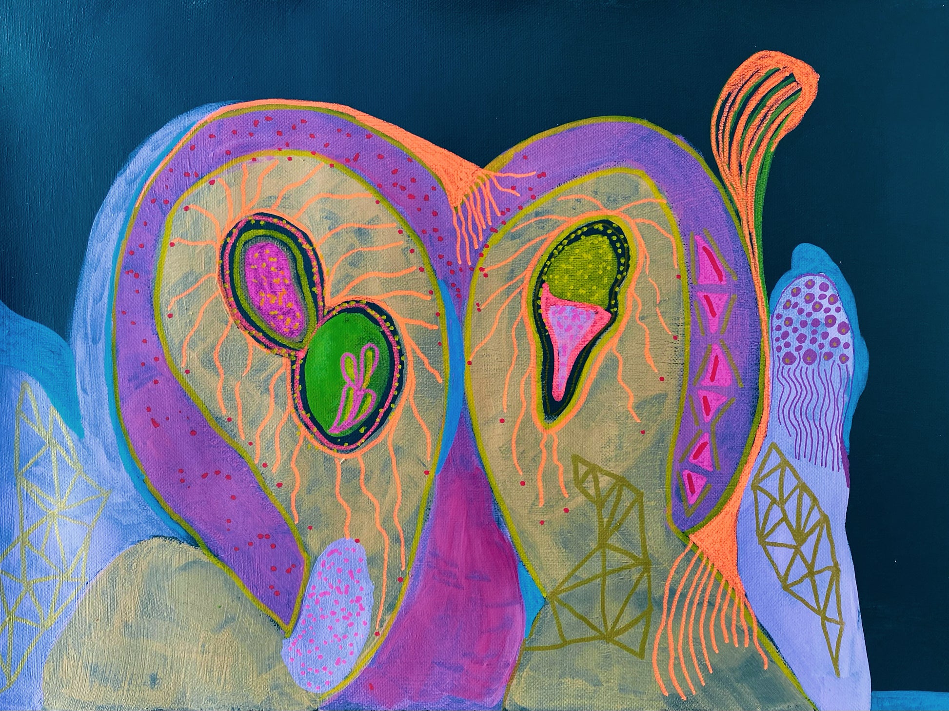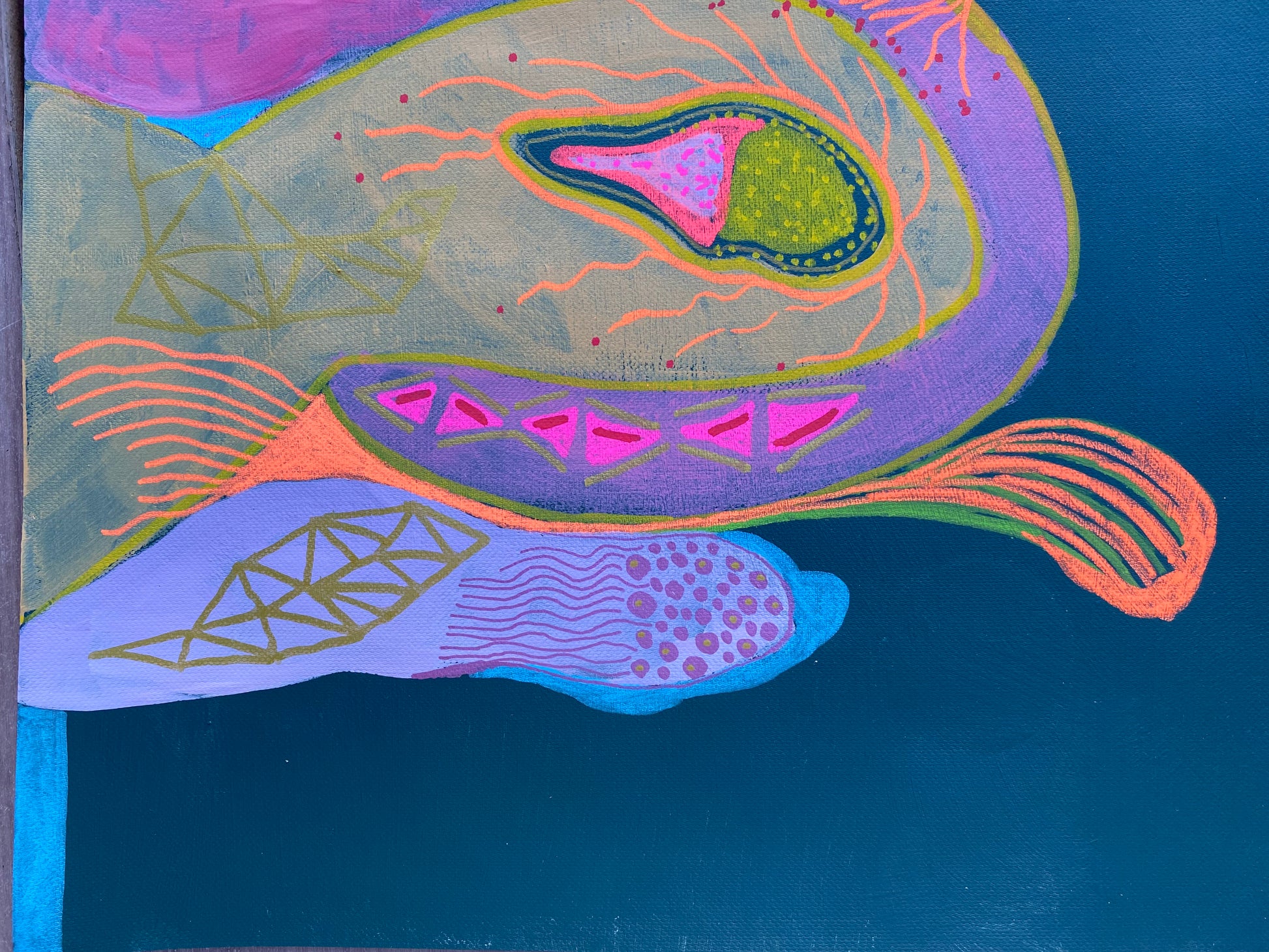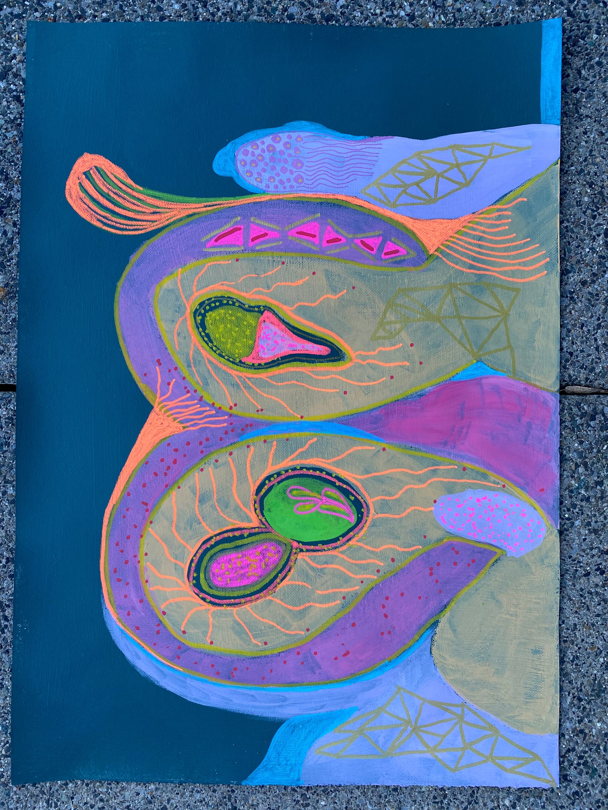 An abstract form/shape mountain at sea ,colourful ,abstract landscape form on green background.