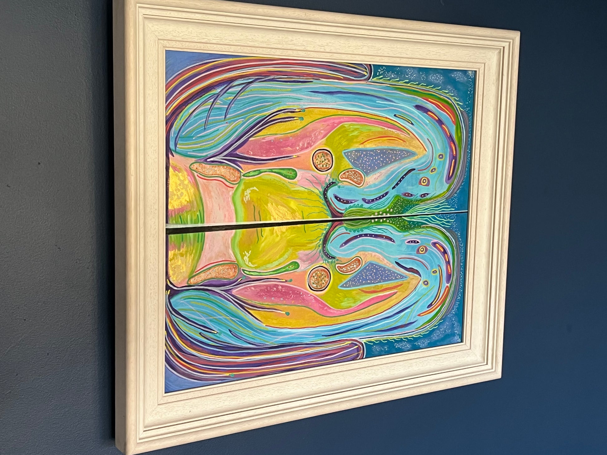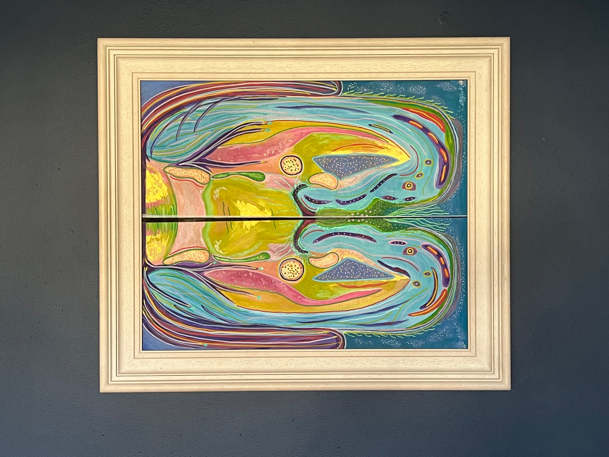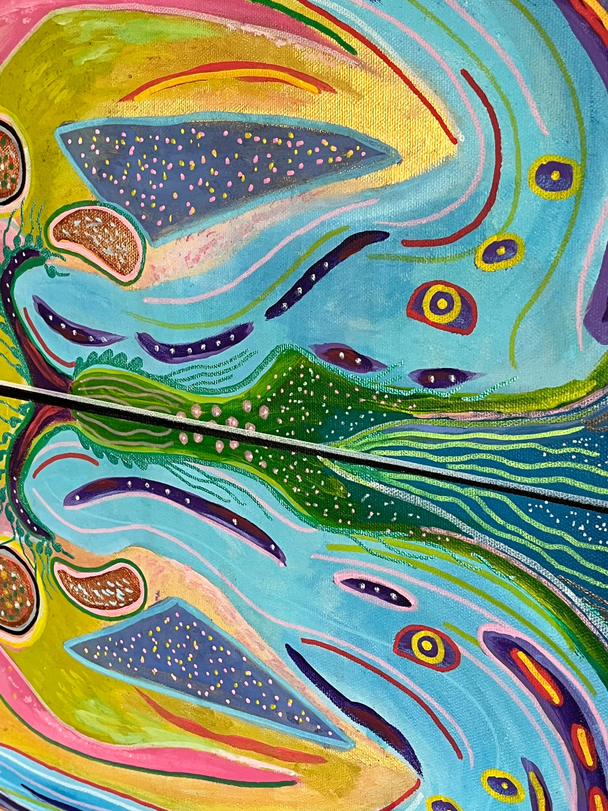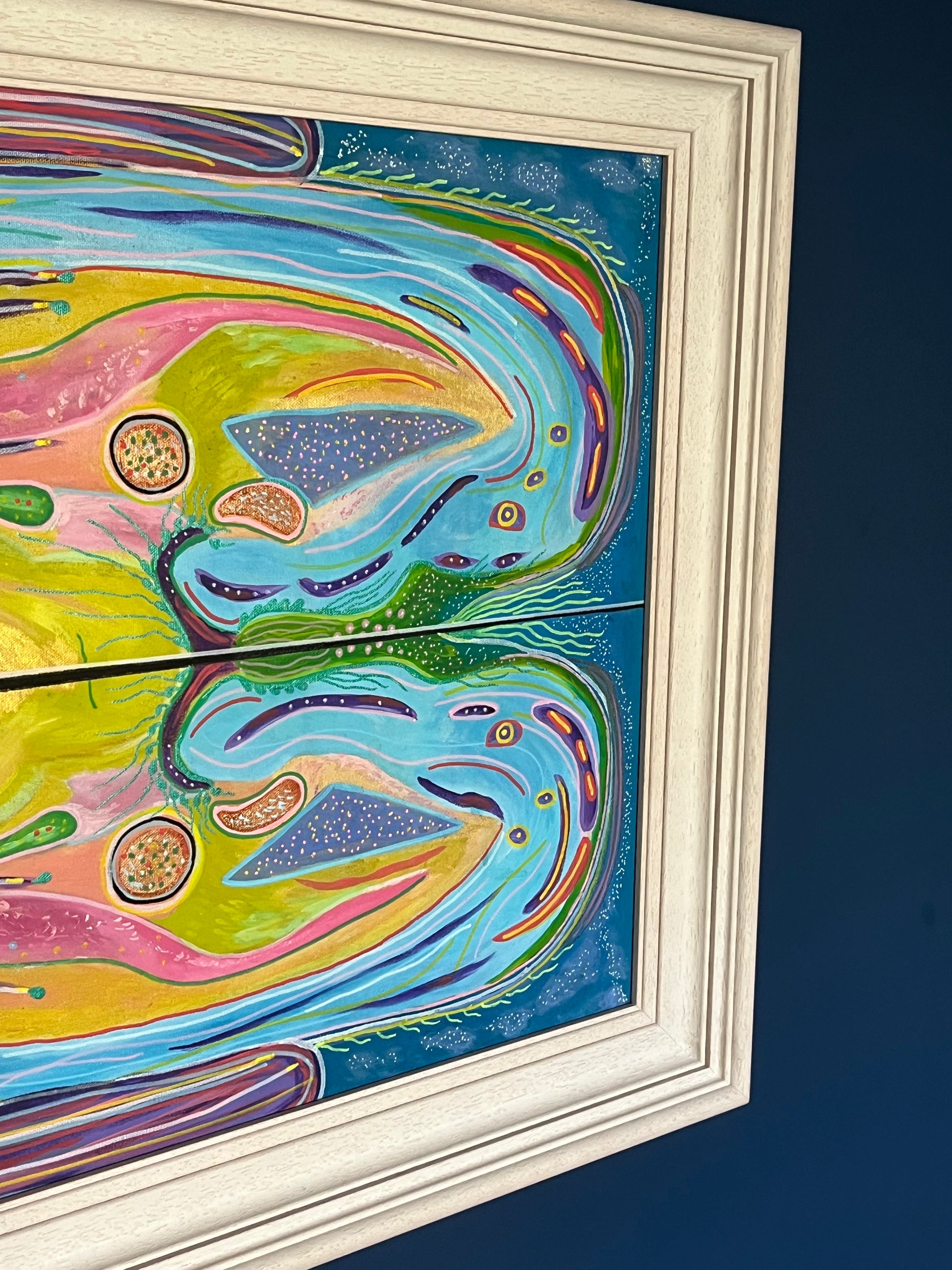 A 20x24 inch painting in acrylics and pen in huge detail imitating a memory of the artists visit to “Lake Tekapo in New Zealand and the vivid reflection in the lake at that time .