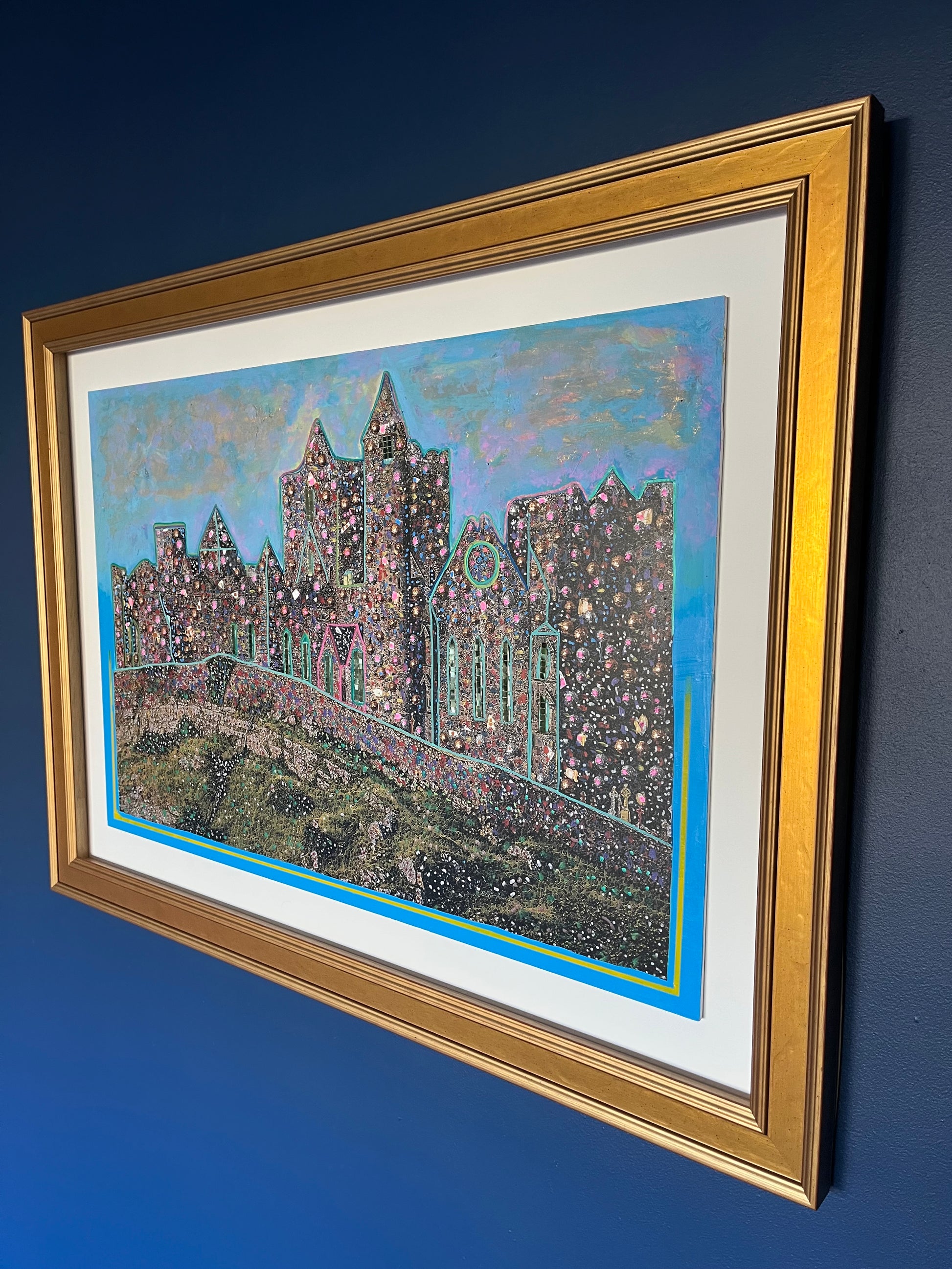 Framed in a thick Gold Luster double fillet frame and white board surround .A highly original and popular depiction of “The Rock of Cashel “ a truly one off find .